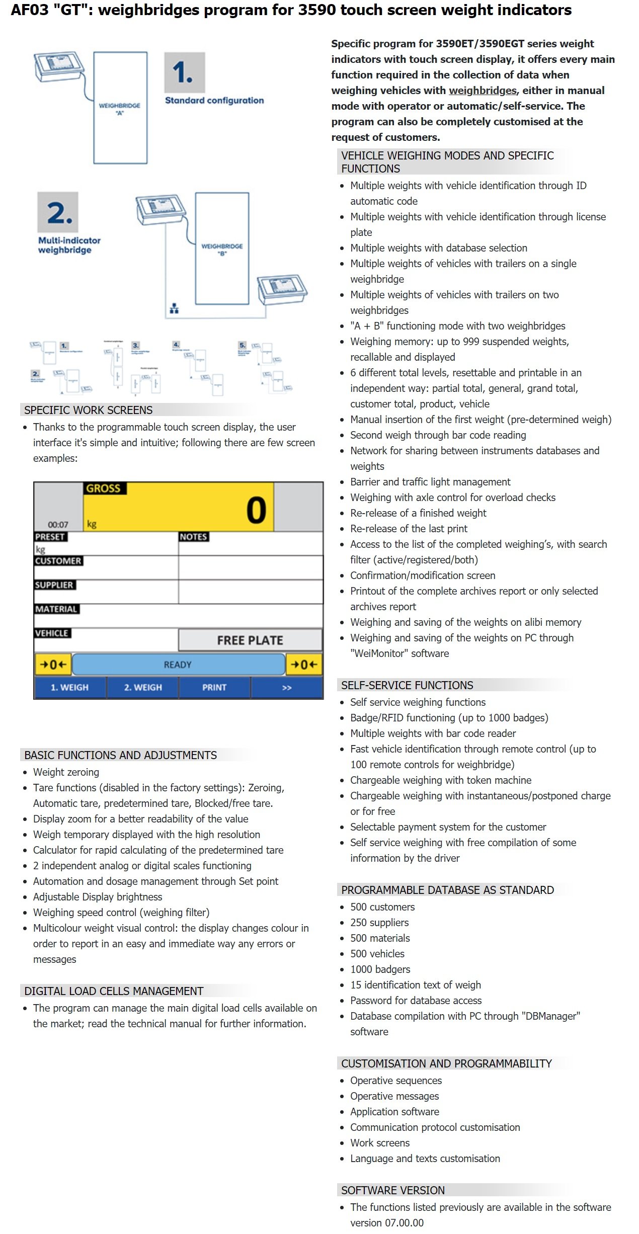 Specific program for 3590ET/3590EGT series weight indicators with touch screen display, it offers every main function required in the collection of data when weighing vehicles with weighbridges, either in manual mode with operator or automatic/self-service. The program can also be completely customised at the request of customers.